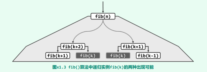 在该算法的递归跟踪图中,每向下递归深入一层,入口参数就减一(向左)或减二(向右)。在从入口 fib(n)通往每一 fib(k)递归实例的沿途,各递归实例的入口参数只能依次减一或减二。因此,fib(k)出现的次数,应该等于从 n 开始,经每次减一或减二,最终减至 k 的路径总数。