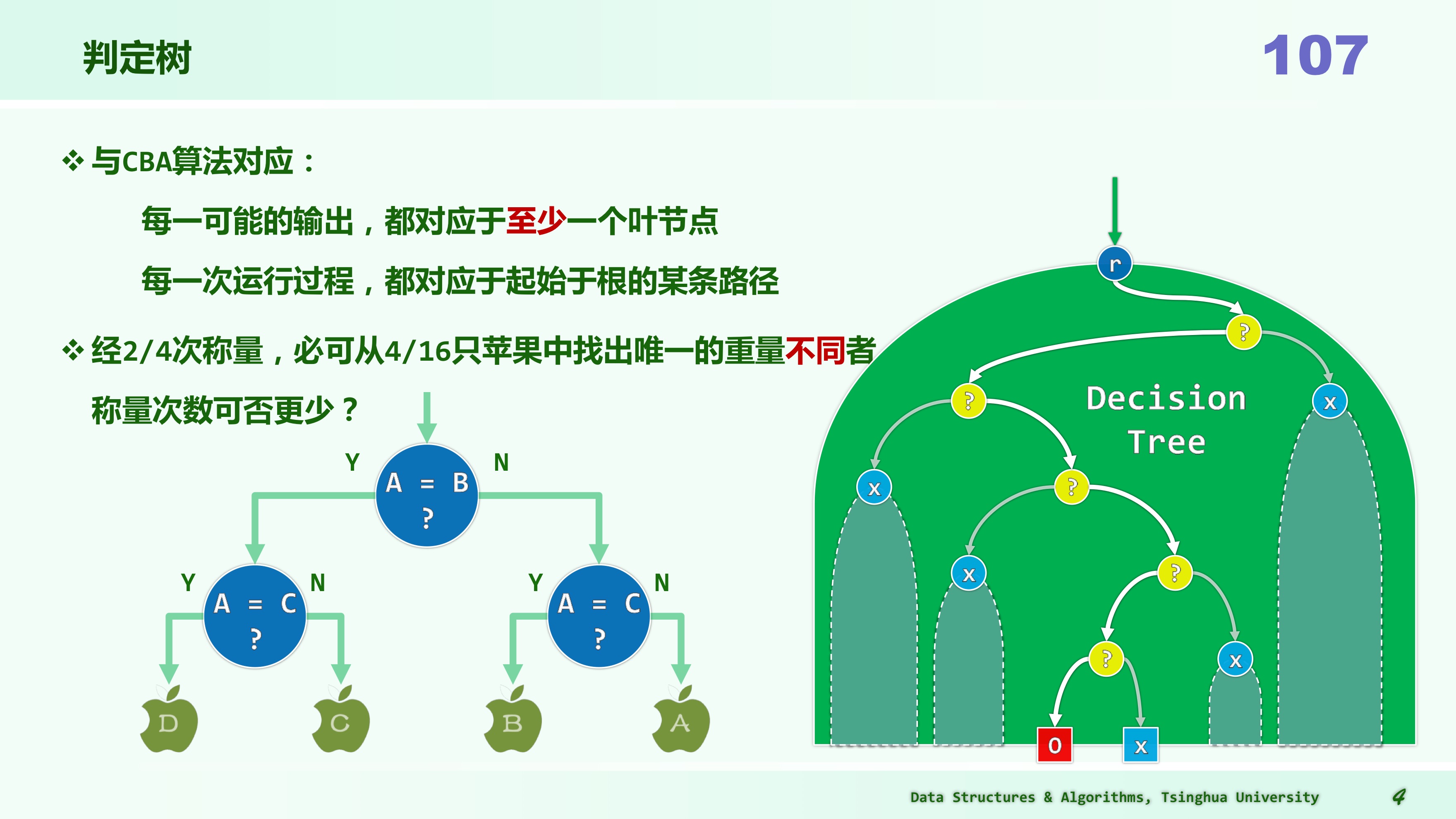 与 CBA 算法对应的判定树:每一可能的输出都至少对应于判定树的一个叶节点,每一次运行过程都对应起始于根的某条路径。