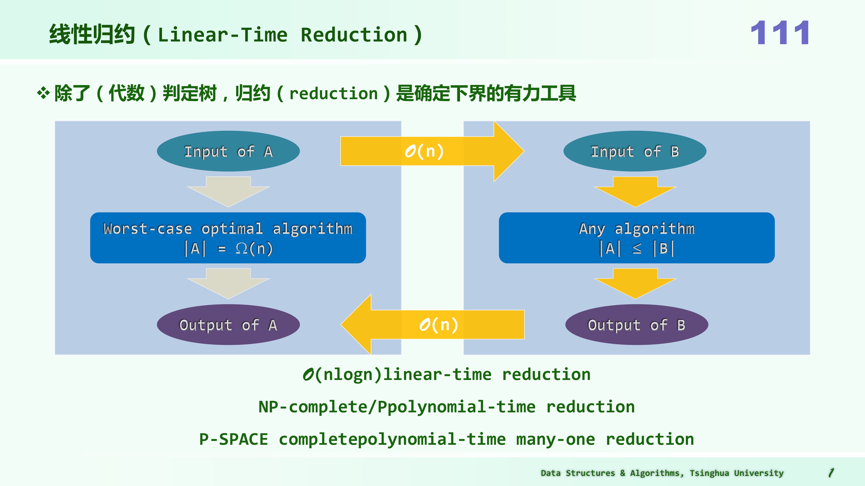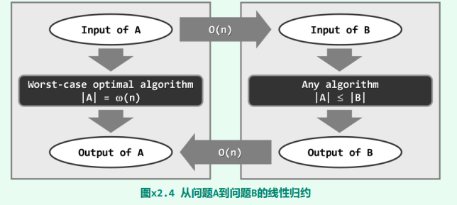 归纳起来,为运用线性归约界定问题 B 的难度下界,须经以下步骤: 1)找到难度已知为 ω(n)的问题 A 2)证明问题 A 可线性归约为问题 B——其输入、输出可在线性时间内完成转换