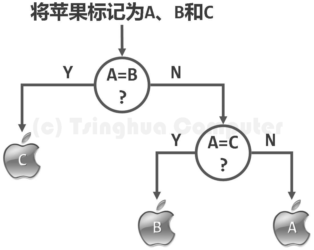比较树是三叉树 ternary tree,每一叶节点对应于起自根节点的一条通路,这条通路是某一可能的运行过程,叶节点对应的就是输出结果。