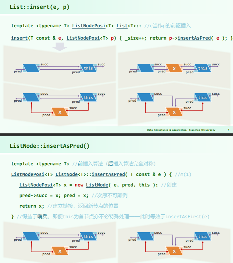 ListNodePosi<T> insertAsPred( T const & e ); //前插入