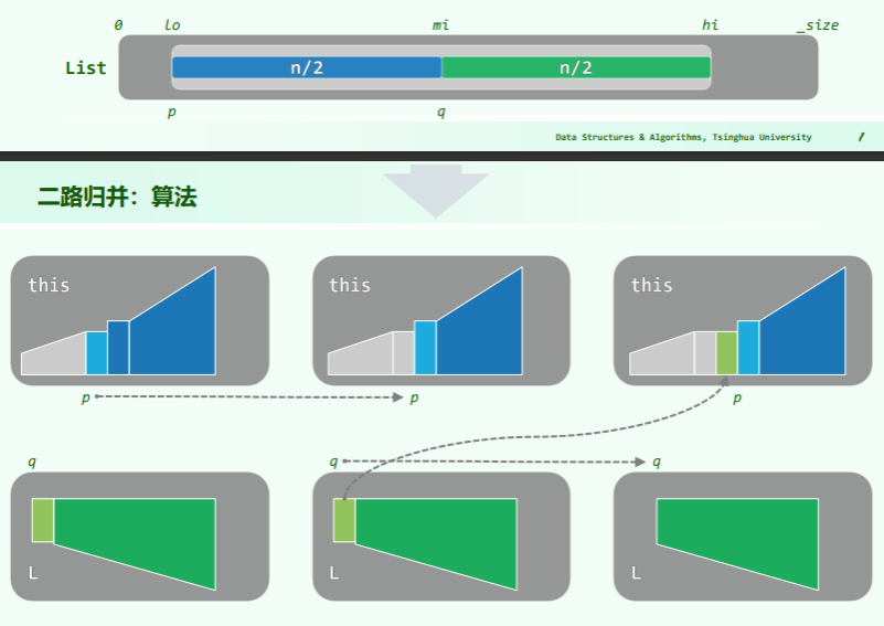 } //若归并可在线性时间内完成,则总体运行时间亦为O(nlogn)二路归并