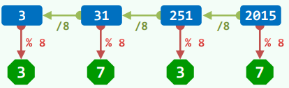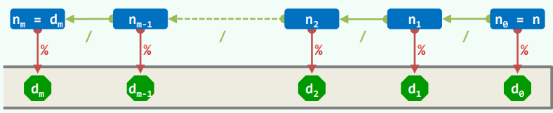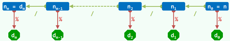 如此对 反复整除、取余,即可自低而高得出 进制的各位。