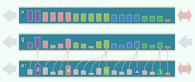 使用两个队列 Q 和 P,Q 存储数据并且是单进单出;P 存放 Q 的后缀的最大值,并且允许队尾插入和删除两种操作,即单进双出: