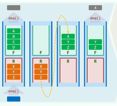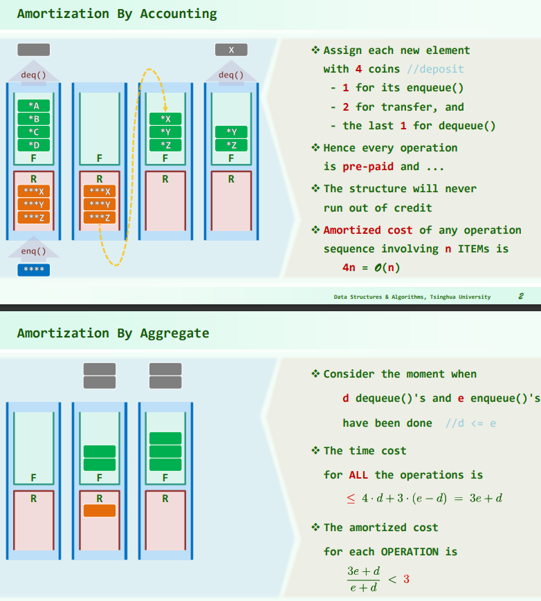 Queap::getMax(){return P.front();}Queap::dequeue(){P.dequeue();return Q.dequeue();}//O(1)Queap::enqueue(e){Q.enqueue(e);P.enqueue(e);for(x=P.rear();x && (x->key <=e);x=x->pred) x->key=e;} // 最坏O(n)