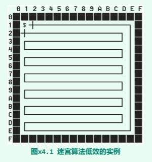 根据该算法的控制流程,在每个格点都是固定地按照东、南、西、北的次序,逐个地试探相邻的格点。因此,尽管在此例中目标终点就紧邻于起始点的西侧,也只有在按照如图所示的路线,遍历过所有的(n - 2)2个格点之后,才能抵达终点。 -