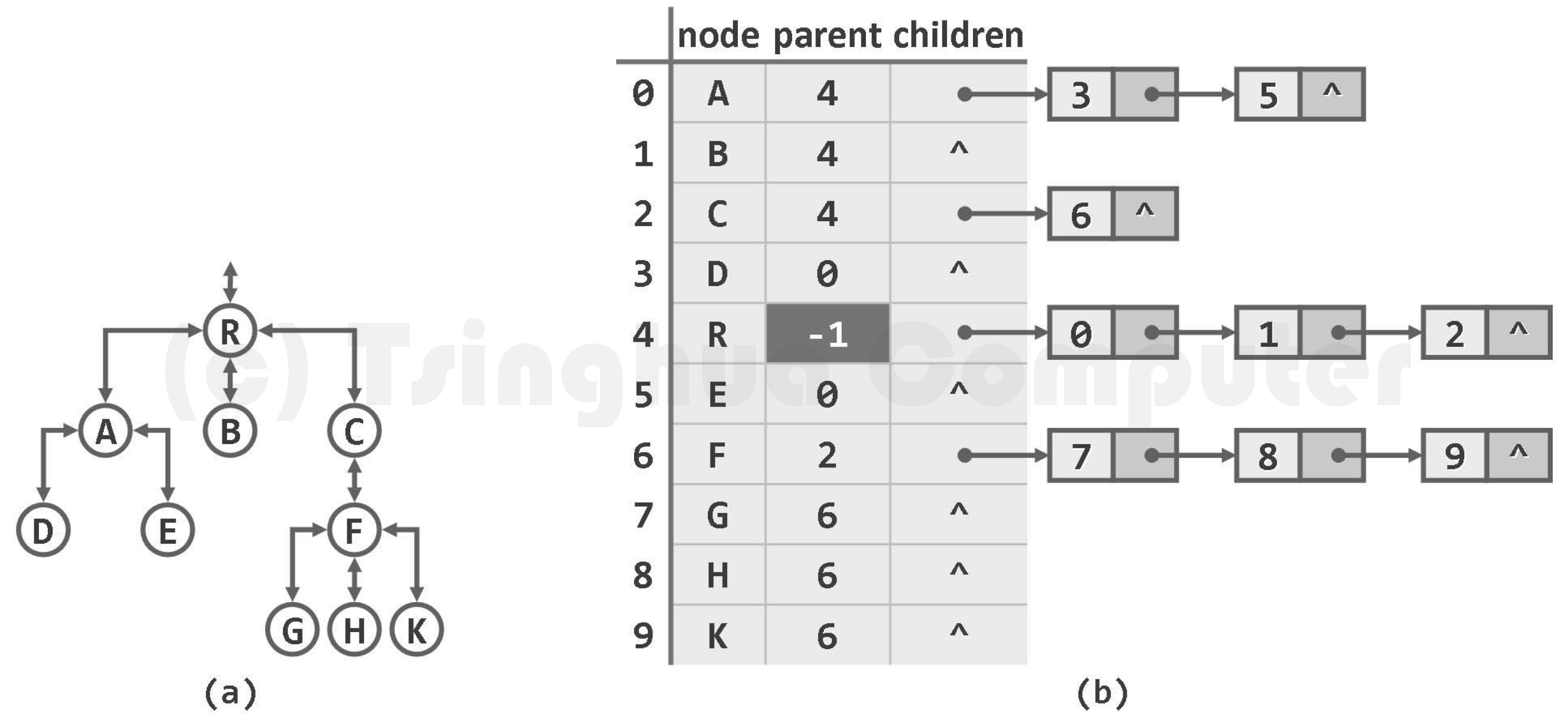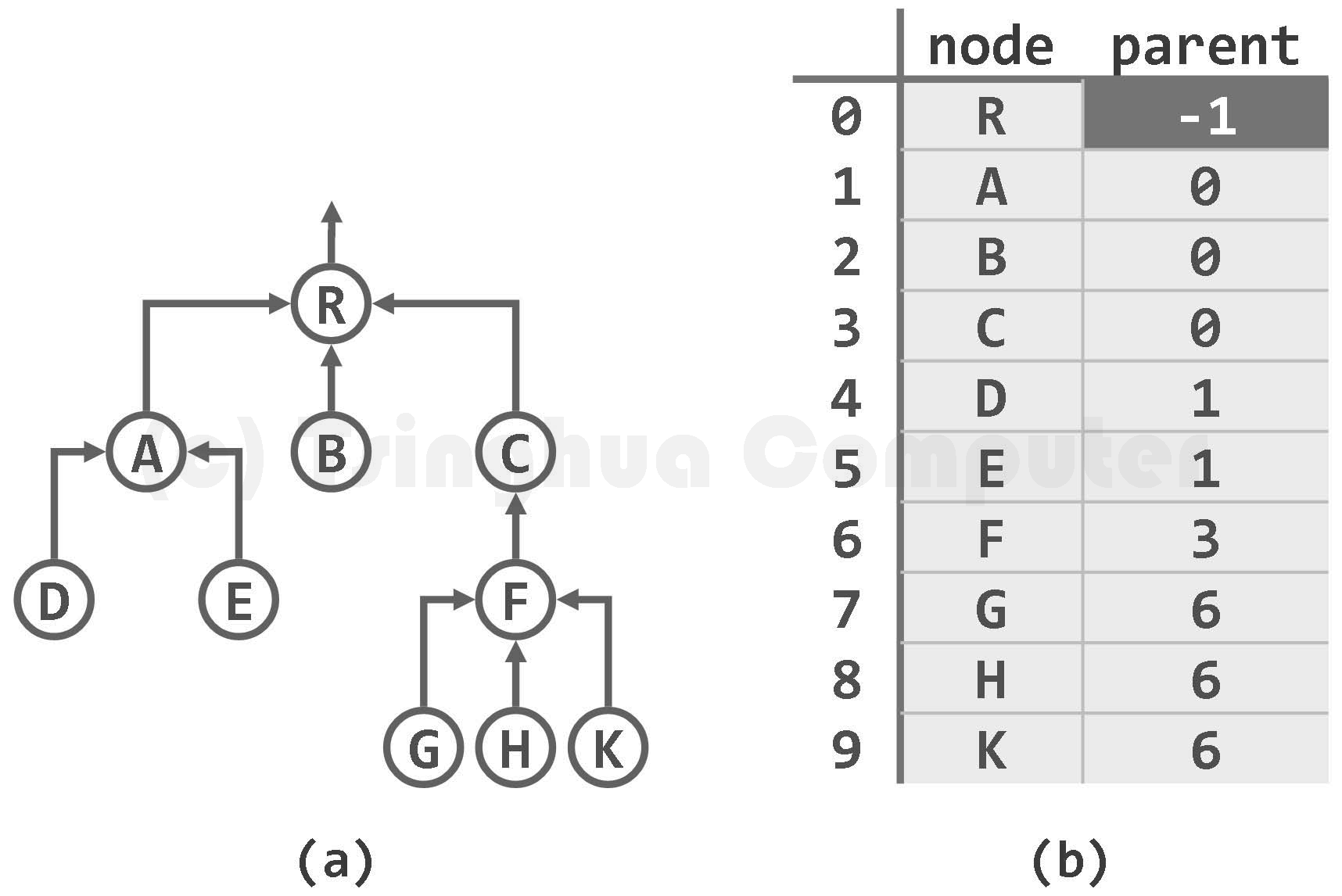 父亲表示:节点组织为一个序列,各自记录:data 本身信息、parent 父节点的秩或位置