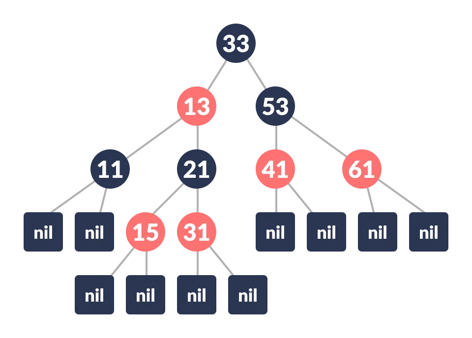 - Depth Property: For each node, any simple path from this node to any of its descendant leaf has the same black-depth (the number of black nodes).