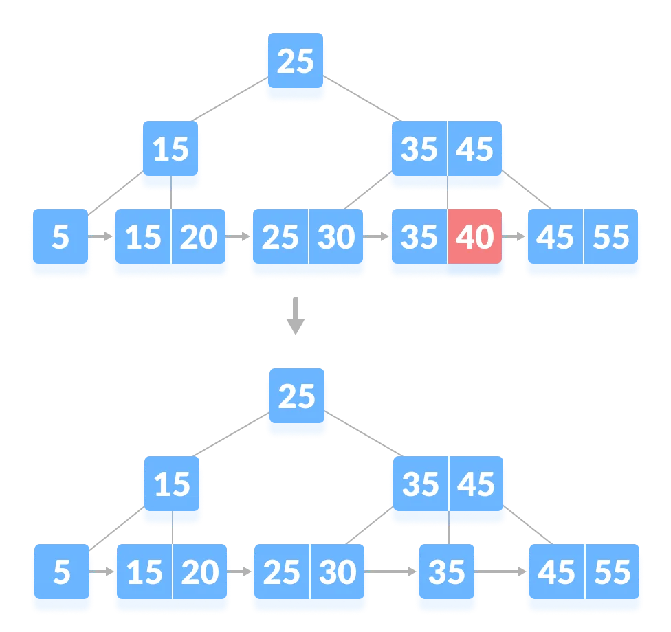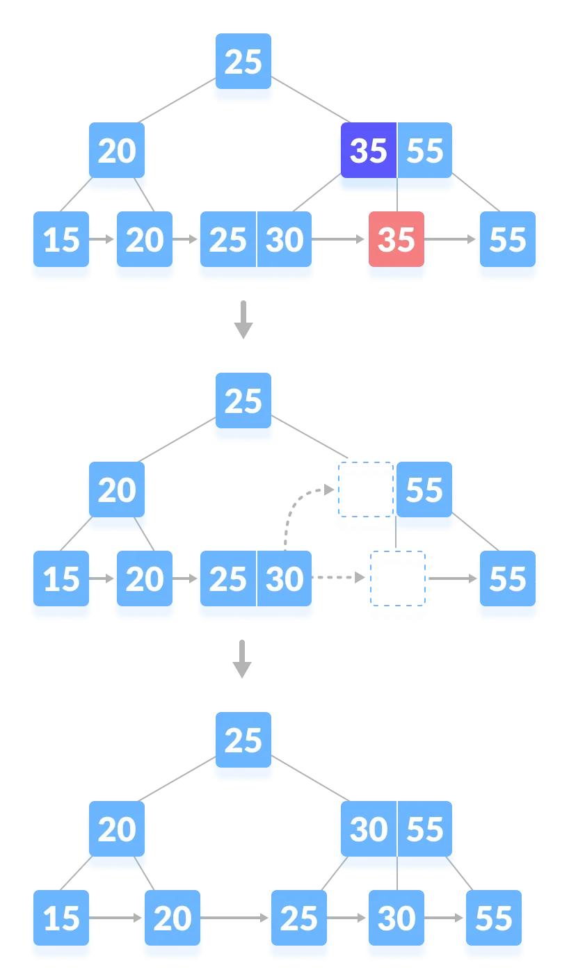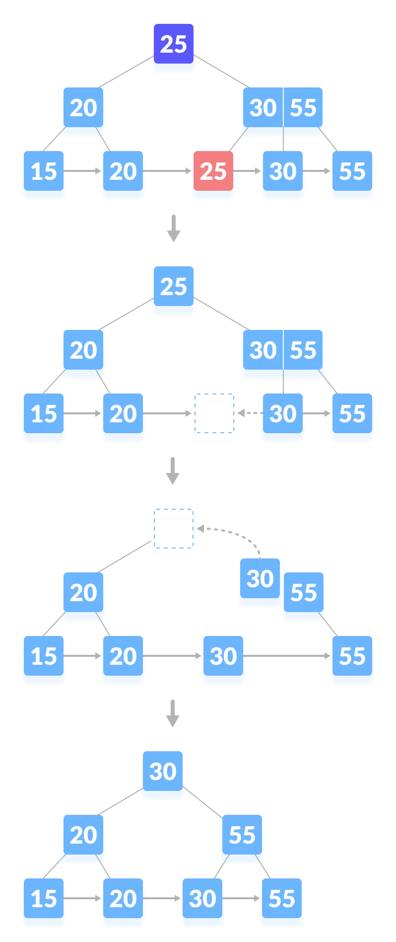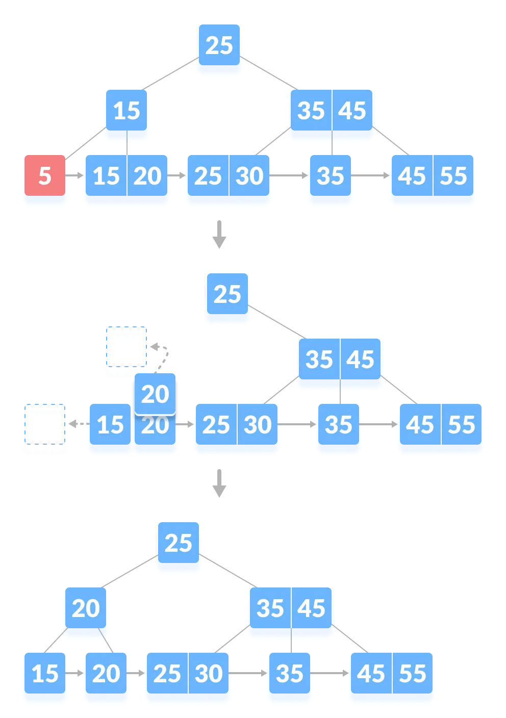If there is an exact minimum number of keys in the node, then delete the key and borrow a key from its immediate sibling (through the parent). Fill the empty space created in the index (internal node) with the borrowed key.