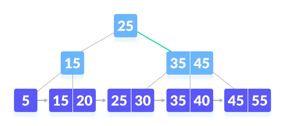 ⌈m/2⌉children. (i.e. 2) - A node (except root node) should contain a minimum of