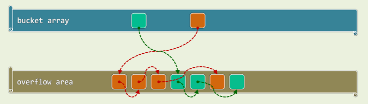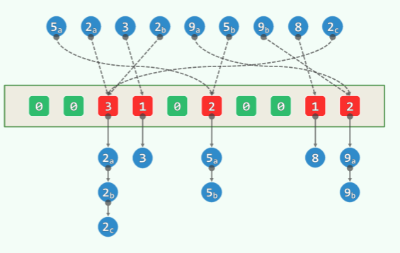 - 桶 bucket:直接存放或间接指向的一个词条;