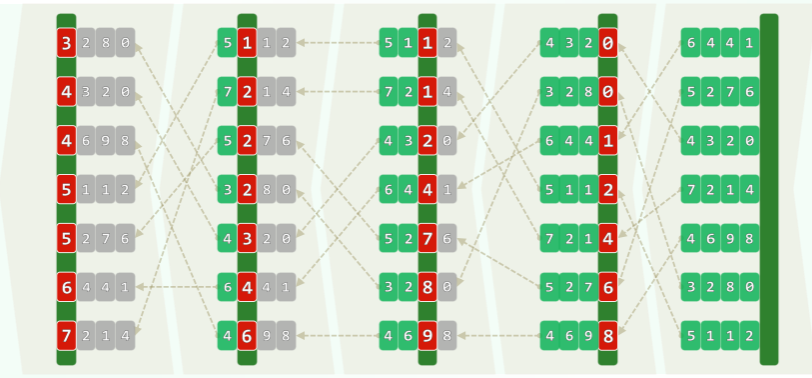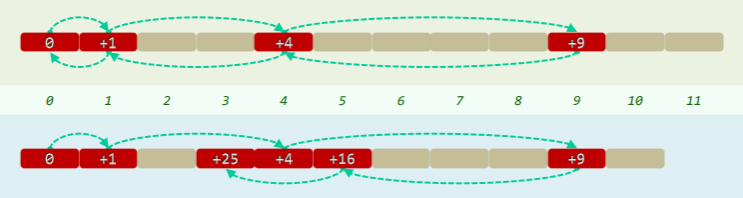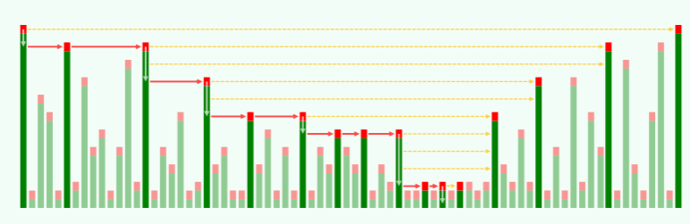- 观察得知:横向跳转所经的节点必然依次紧邻,而且每次抵达都是塔顶