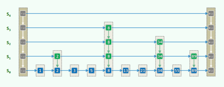 - 因此,查找过程中,纵向跳转的次数累计不超过 expected-O (logn)