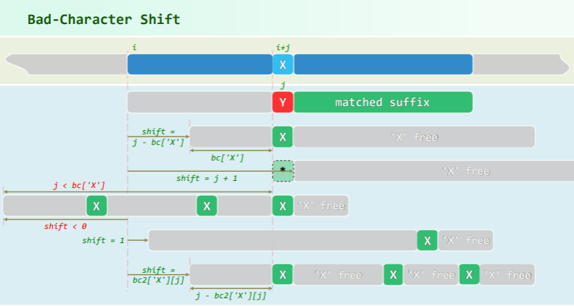 如此,尽管预处理时间和所需空间的增长量并不大,但匹配算法的逻辑控制却进一步复杂化。 最重要的是,此类二维 bc[][] 表若能发挥作用,则当时的好后缀必然很长——此类情况,同时使用的 gs[] 表完全可以替代 bc[][] 表。