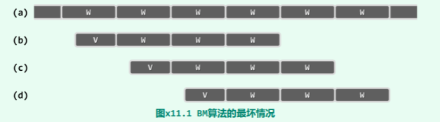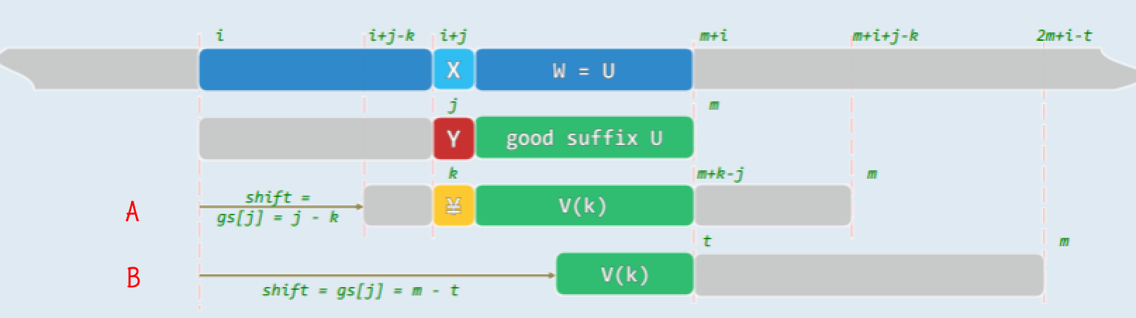 这里的技巧是,在此类对齐位置,不必一直比对至 P 的最左端。实际上不难看出,一旦自右向左比对到原文本串 T 中好后缀的最右端,即可马上判定是否完全匹配。仍以图 x11.1为例,除了第一轮比对,在后续的各轮比对中,均只需比较模式串 P 中最靠右的 w 个字符——根据 gs[] 表的定义,其余的 m - w 个字符必然是匹配的。