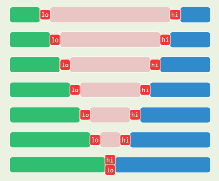 - 遇到连续的重复元素时, lo 和 hi 会交替移动,切分点接近于 (lo+hi)/2