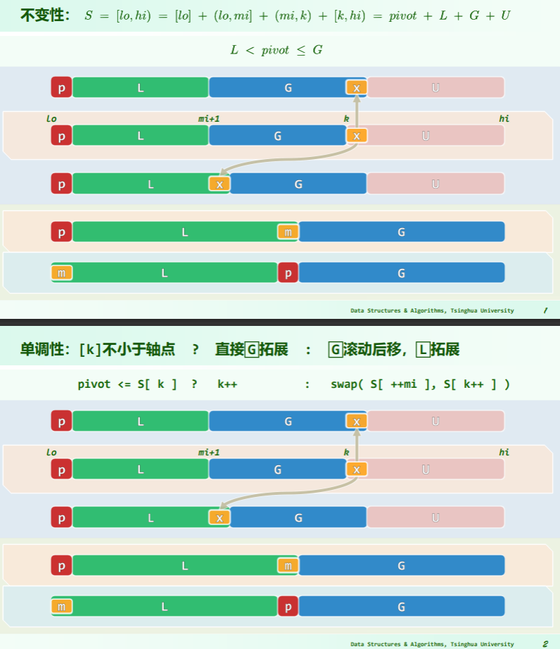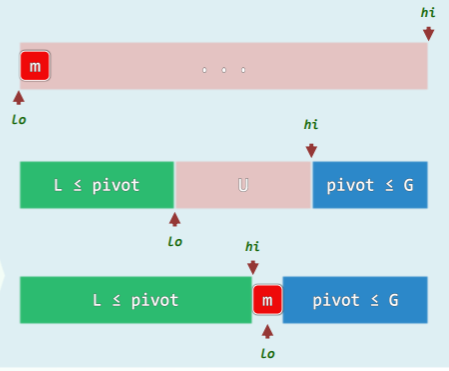 L <= pivot <= G且U=[lo,hi)中,[lo]和[hi]交替空闲- 故序列中 U 部分单调减少,L 和 G 部分单调增加,这趟扫描一定能结束并正确归位 pivot