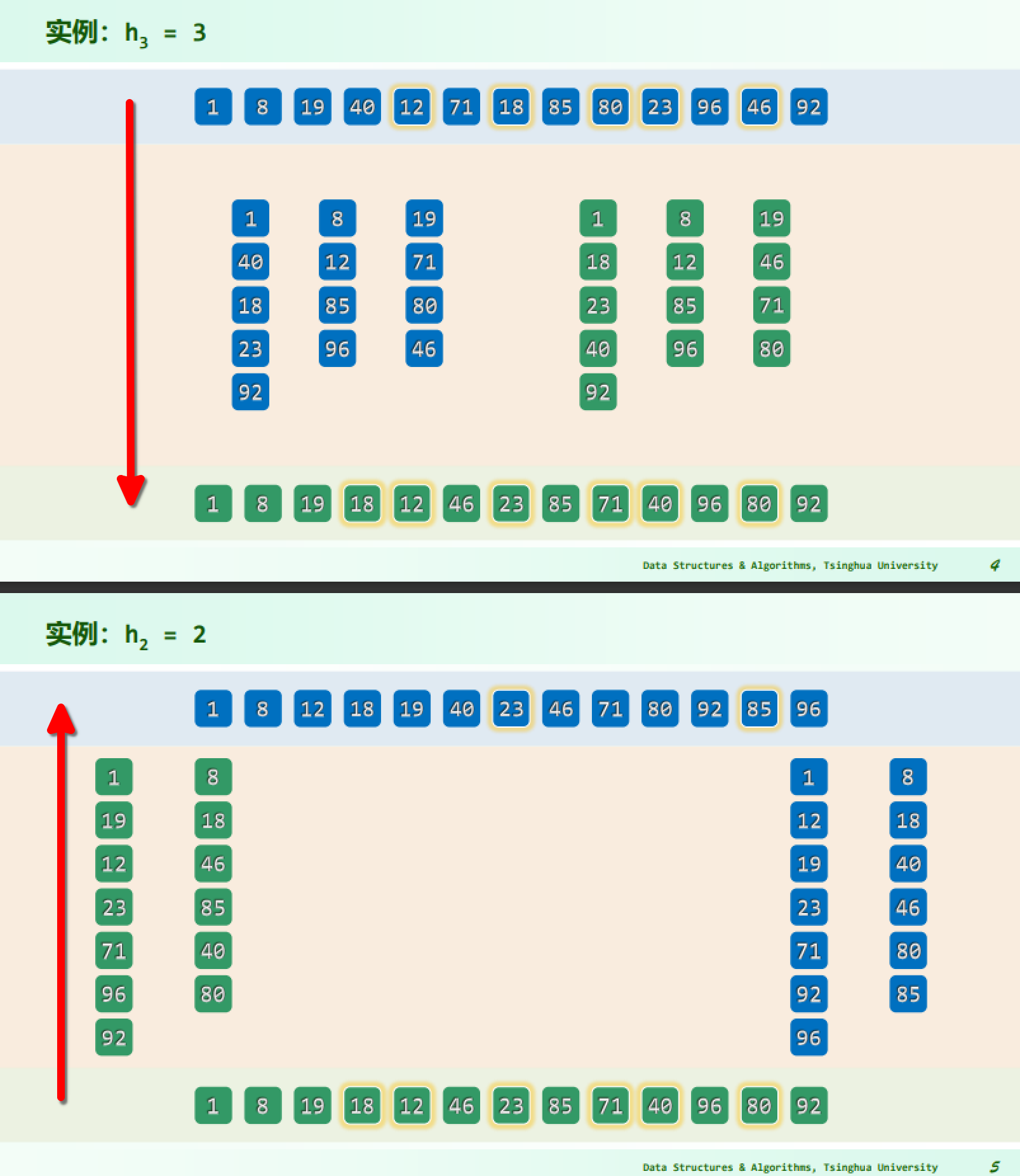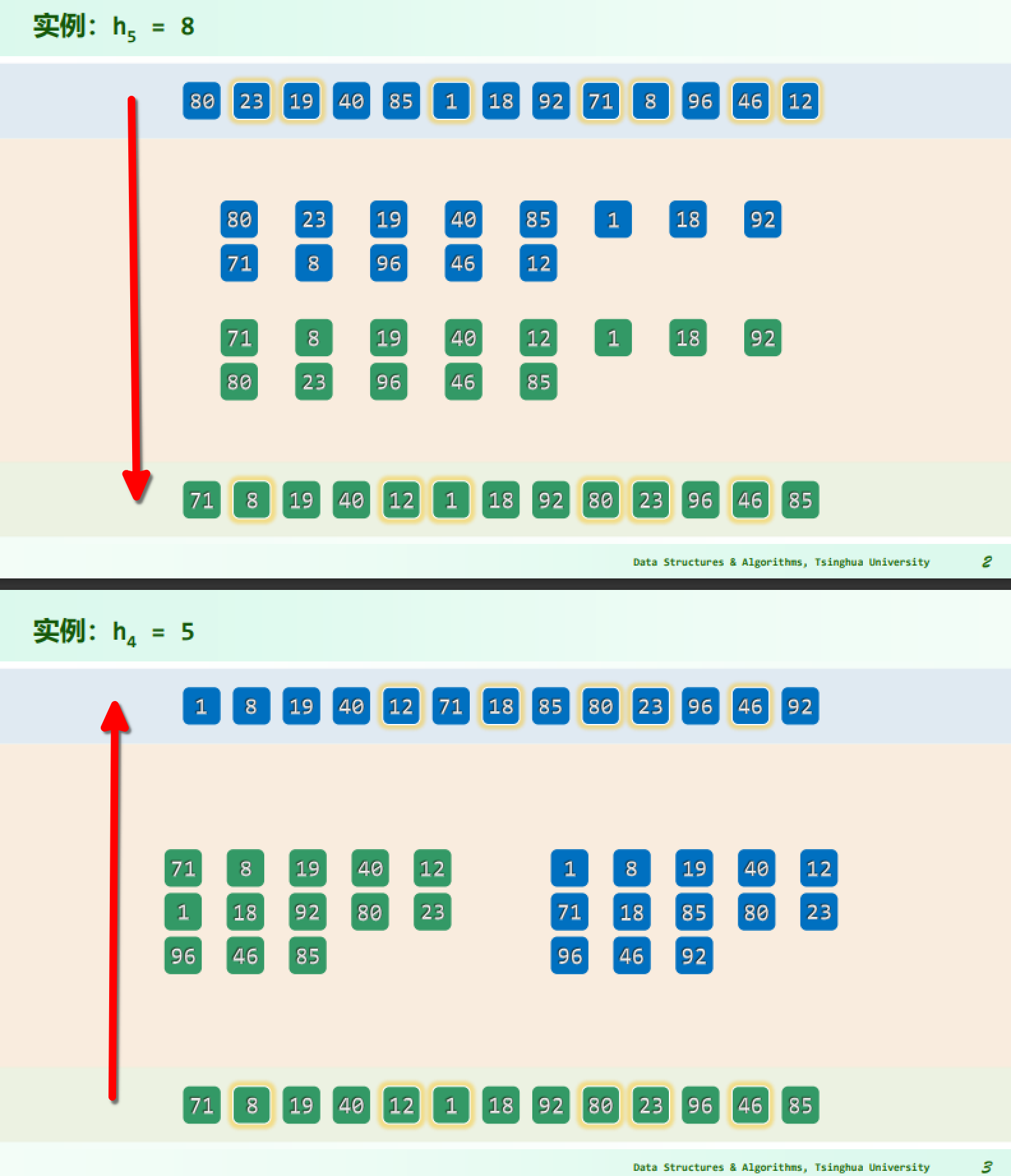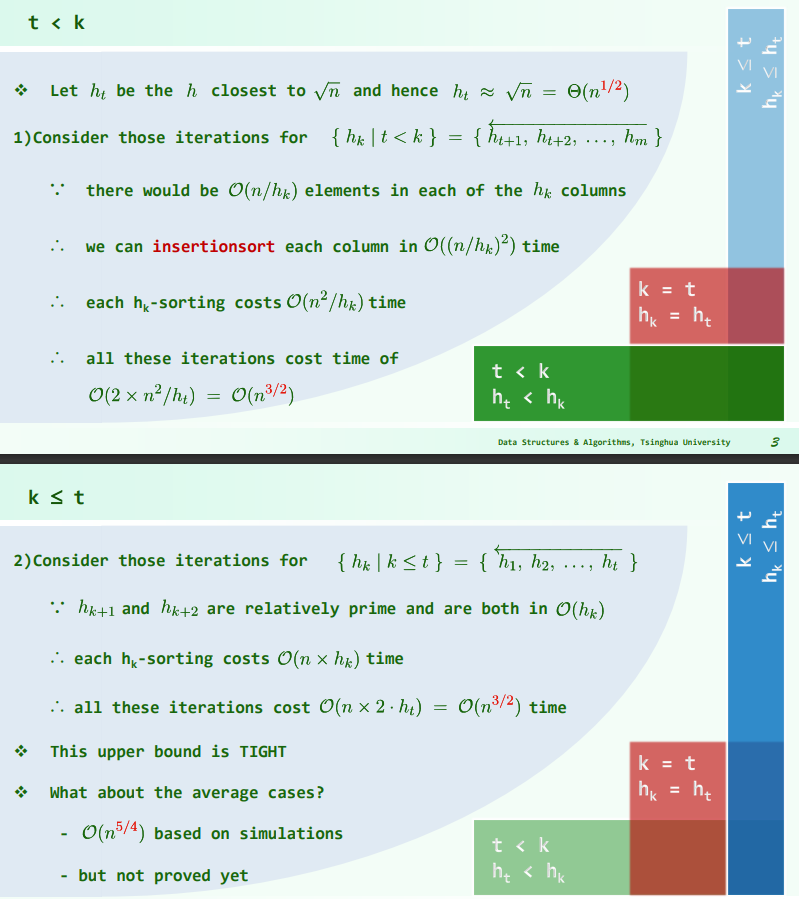 - Knuth 给出了一个重要结论:已经 g-sorted 的向量,再经一次 h-sorting,必然仍保持 g-sorted,此时对 h 和 g 都有序,记作 (g, h)-sorted.