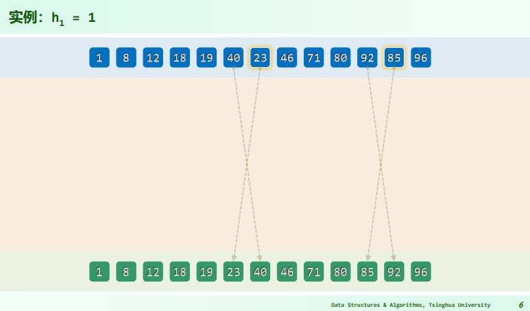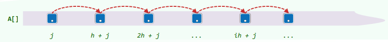 在向量 S[0,n) 中,若 S[i]<=S[i+h] 对任何 0<=i<n-h 均成立,则称该向量 h-sorted,将向量由 h-unsorted 进行排序操作得到 h-sorted 状态的过程,称作 h-sorting: