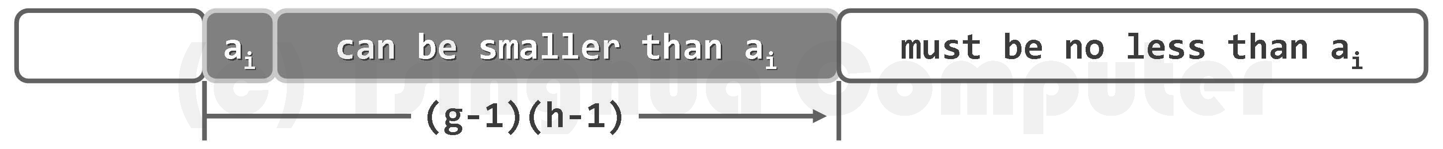 - 在分别做过 g-排序与 h-排序之后,根据 Knuth 的结论可知该向量必已 (g, h)-有序。由以上分析,对于 g 和 h 的任一线性组合 mg + nh,该向量也应 (mg + nh)-有序。因此反过来,逆序对的间距必不可能是 g 和 h 的组合。而根据此前所引数论中的结论,只要 g 和 h 互素,则如图所示,逆序对的间距就绝不可能大于 (g - 1)∙(h - 1)。