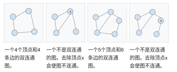 - 无关节点的图,称作双(重)连通图 (bi-connectivity):任何一个顶点被去除,图仍是连通的