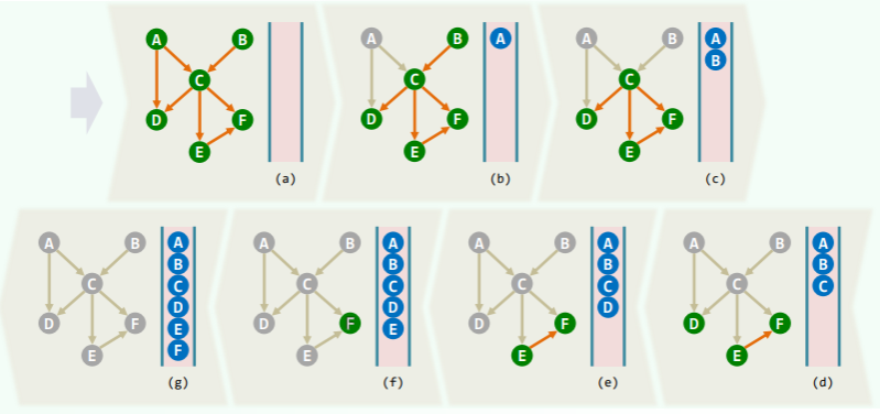 - 任给有向图 G(不一定是 DAG),尝试将所有顶点排成一个线性序列,使其次序须与原图相容(意即,每一顶点都不会通过边指向前驱顶点)