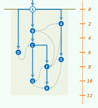 - 其间每当有顶点被标记为 VISITED,则将其压入 S,一旦发现有后向边,则报告“NOT_A_DAG”并退出 (出现了环,不再是 DAG)