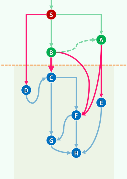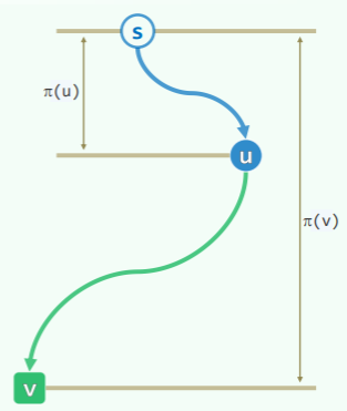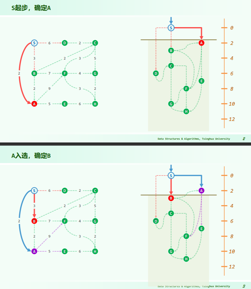 - 在图 G 及其子图中,每一轮都为可在一条路径可达的节点标记优先级 priority,其值决定于已确定范围到目标点的距离;