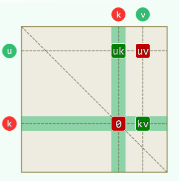将所有顶点随意编号:1, 2, …, n 。定义: 中途只经过前 k 个顶点中转,从 u 通往 v 的最短路径长度: