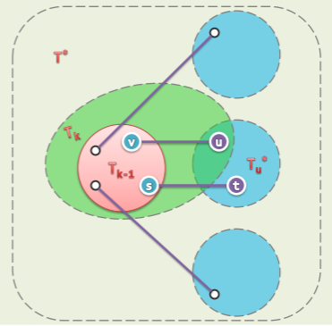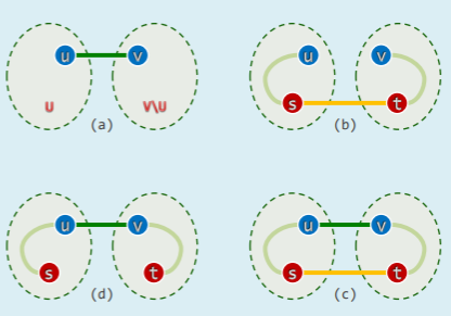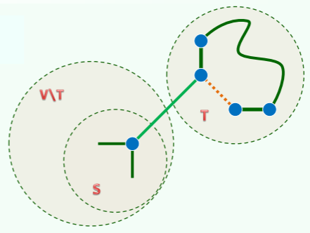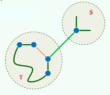 - 设:边 e = (u, v)的引入导致树 T 和 S 的合并
