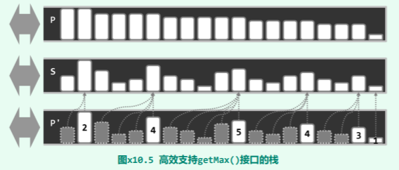 以上方案还可以进一步地优化。 仍如图 x10.5所示,可将栈 P“压缩”为栈 P’。为此,需要注意到,P 中相等的元素必然彼此相邻,并因此可以分为若干组。若假想地令栈 P 中的每个元素通过指针指向栈 S 中对应的元素,而不是保留后者的副本,则可以将 P 中的同组元素合并起来,共享一个指针。当然,同时还需为合并后的元素增设一个计数器,记录原先同组元素的总数。