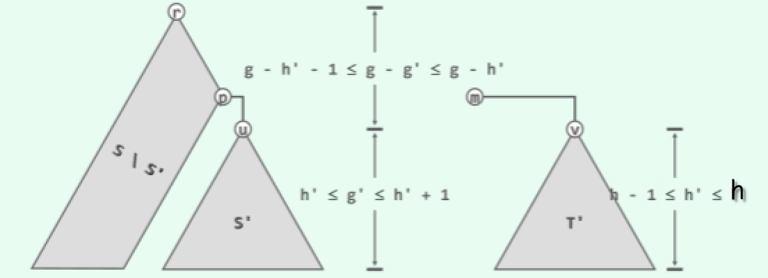 设 m 为 T 中的最小节点。若将 m 从 T 中摘出,则如图 x10.8 所示,新得到的 AVL 树 T’的高度 h’必然不致增加,而且至多降低一层。 根据 AVL 树的定义,这里沿着起自根节点的任一通路每下降一层,节点的高度虽必然降低,但至多降低2。因此如图 x10.8 所示,沿着树 S 的最右侧通路,必然可以找到某个节点 u,其高度不低于 h',而且至多比 T'高一层。将子树 u 记作 S’。