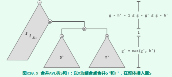 于是接下来如图 x10.9所示,只要以节点 m 为联接点,将 S’和 T’分别作为其左、右子树,即可拼接成为一棵 AVL 树。