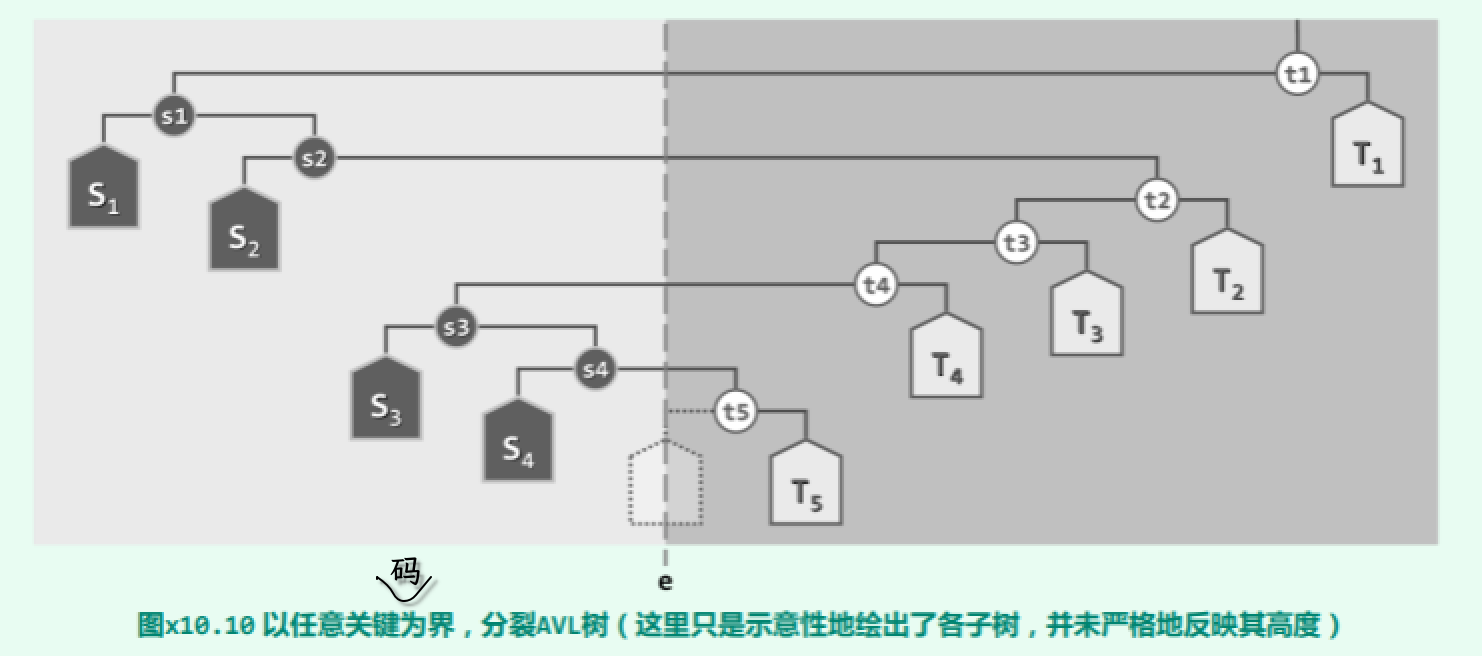 而分裂出的两棵 AVL 子树的中序遍历序列,则应该分别是: S = S1, s1; S2, s2; S3, s3; S4, s4; … T = …; t5, T5; t4, T4; t3, T3; t2, T2; t1, T1