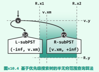 具体地如图 x10.4所示,唯有当 R.x1 位于 v.xm 左侧时,才有必要对左子树 v.lc 做递归搜索;唯有当 R.x2 不位于 v.xm 左侧时,才有必要对右子树 v.rc 做递归搜索。