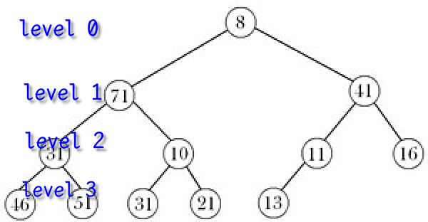 A min-max heap is a complete binary tree containing alternating (交替的) min (or even) and max (or odd) levels. Even levels are for example 0, 2, 4, etc, and odd levels are respectively 1, 3, 5, etc. We assume in the next points that the root element is at the first level, i.e., 0.
