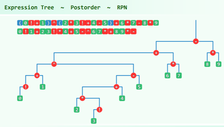 • 最后根据深度决定优先级,去除括号,得到的就是 RPN 式,即对表达式树的后序遍历就是正确的运算: