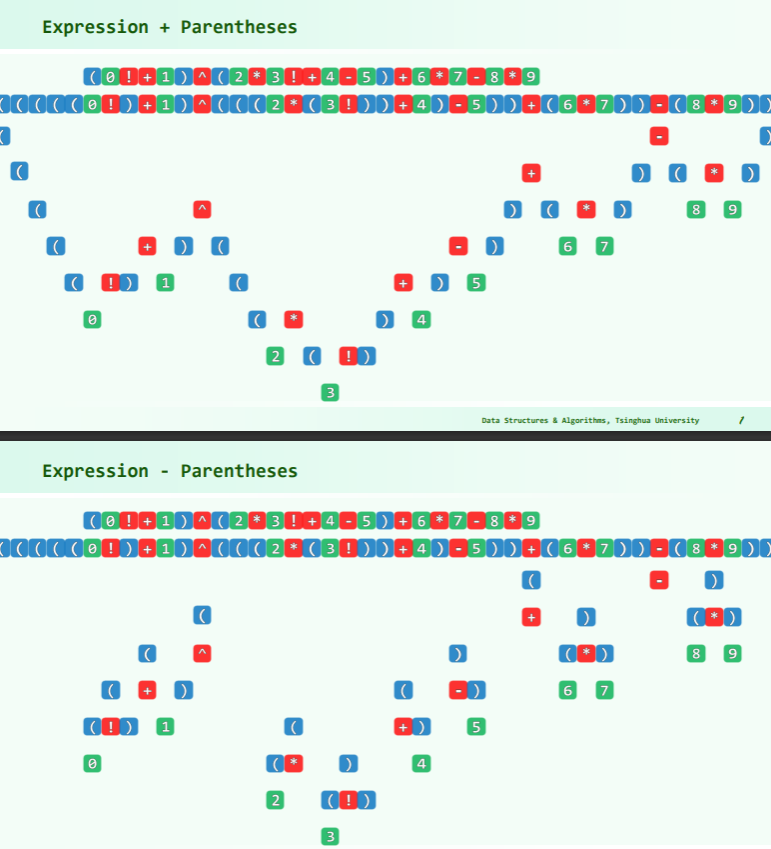 • 之后将操作数摘出,作为运算树的叶节点,将每对括号与运算符匹配;