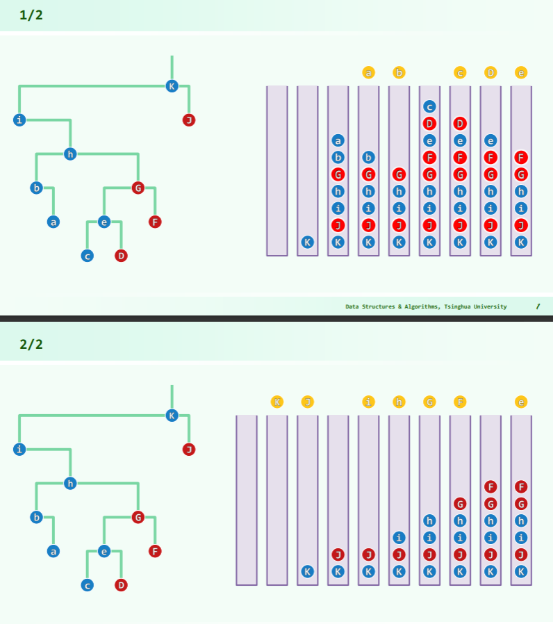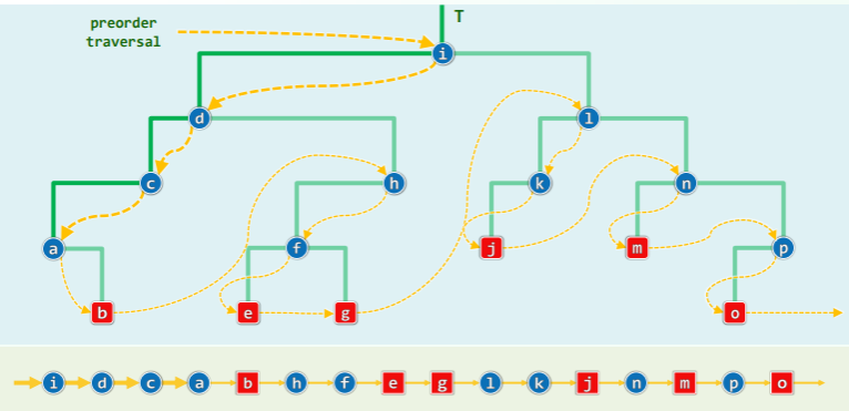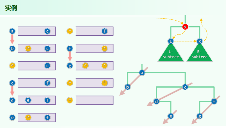 • 从根出发下行,尽可能沿左分支前进,实不得以再沿右分支,左右分支都不存在,才返回;