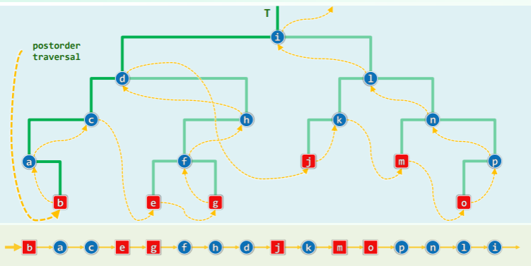 • 于是后序遍历分解为依次对若干棵右子树遍历的问题,此处次序是沿左侧藤最底部左节点向上的次序。此时问题的关键是找到首先被访问的节点;