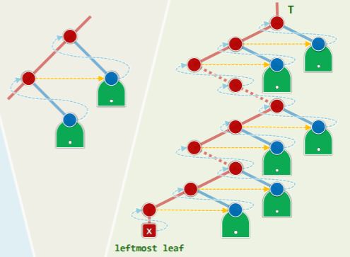 • 第一个找到的节点,是每个子树的叶子,并且是其中序遍历次序的最靠左者