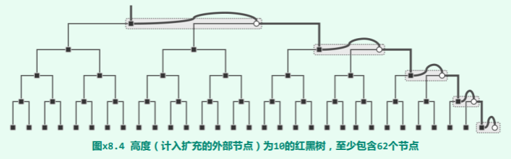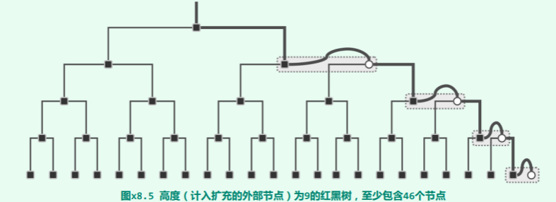 • 而节点 8 的黑高度是 2,黑深度是 1,和为 3,恰好等于根到外部节点通路上的黑节点总数。