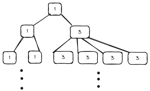 • 而总关键码数有关系式 ,解得树高与关键码数的关系式为 ,因此代入 的关系式中,可解得 (这里看起来和前式矛盾,是因为有一步做了不恰当的截断——h 的计算是损失了部分精度的,但是无关大雅,这里也恰恰能够表明,右子树的关键码总数占据了全树的绝大部分),此时最小左偏率为
