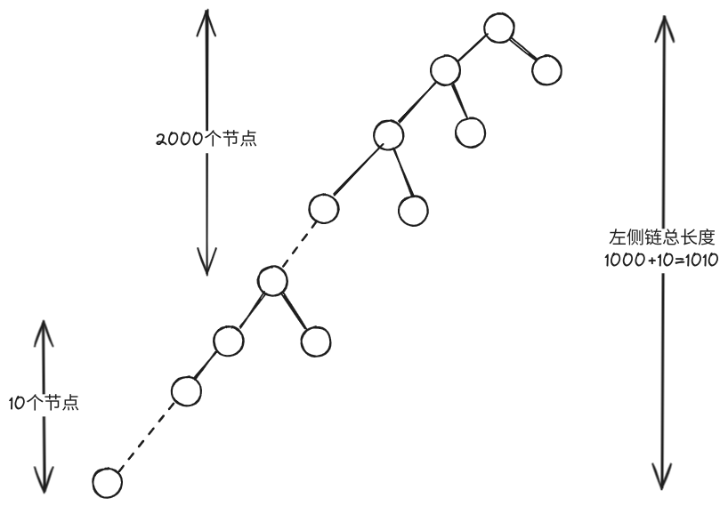 中序遍历辅助栈中元素数,即为当前节点在左链中的祖先数+当前节点右子树的左链长度。 而要使二叉树高度最大,形态应当如下: