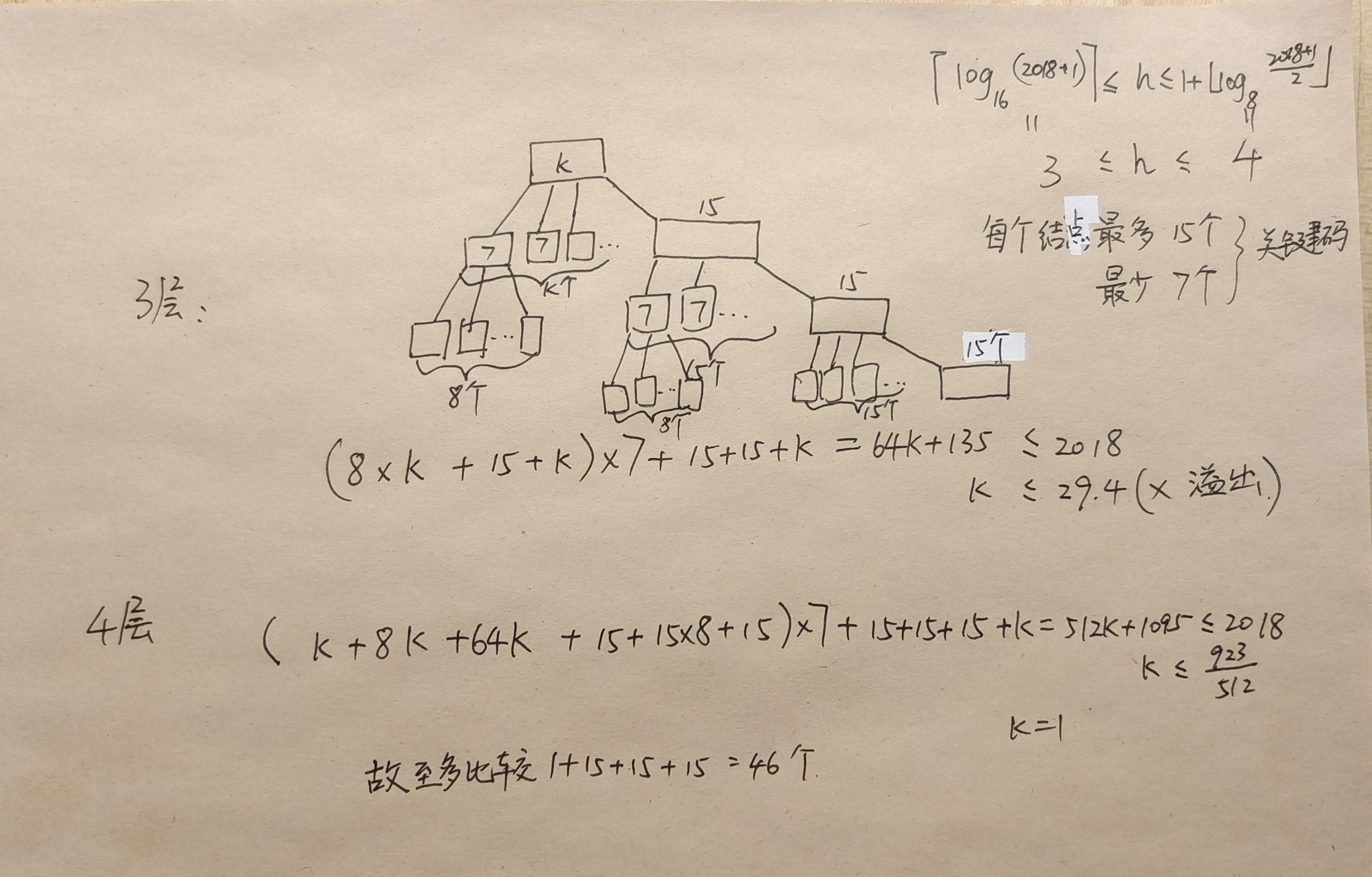 显然根据四层公式 ,因此这些关键码不足以支撑起 4 层并且右侧节点是 15 个关键码的 BTree。 考虑三层,则有 解得 ,即 k=13,则至多关键码比较数为 13+15+15=43