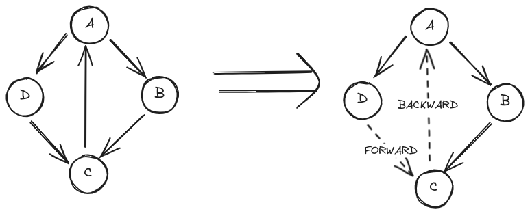 - 有向图经 DFS 后若共有 k 条边被标记为 BACKWARD,则应该恰有 k 个环路。