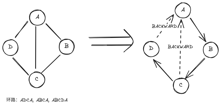 但是无向图只有 BACKWARD,能够保证其中的环路数和 BACKWARD 边数一致吗?答案也是否定的: