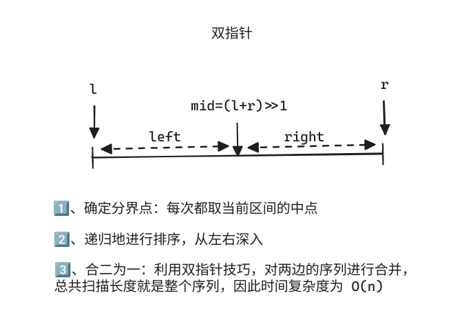 void merge_sort(int q[], int l, int r){ if (l >= r) return; // 递归基 int mid = l + r >> 1; merge_sort(q, l, mid); merge_sort(q, mid + 1, r); // 递归 int k = 0, i = l, j = mid + 1; //k用于计数已经完成了多少个合并,i和j分别表示左右边界 while (i <= mid && j <= r) if (q[i] <= q[j]) tmp[k ++ ] = q[i ++ ]; else tmp[k ++ ] = q[j ++ ]; while (i <= mid) tmp[k ++ ] = q[i ++ ]; //有剩余元素的话直接接到末尾 while (j <= r) tmp[k ++ ] = q[j ++ ]; for (i = l, j = 0; i <= r; i ++, j ++ ) q[i] = tmp[j];}