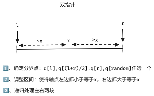 void quick_sort(int q[], int l, int r){ if (l >= r) return; // 递归基 int i = l - 1, j = r + 1, x = q[l + r >> 1]; // 设置哨兵、分界点 while (i < j) { do i ++ ; while (q[i] < x); do j -- ; while (q[j] > x); // 分别从左右两端开始,一直找到不符合区间要求的点 if (i < j) swap(q[i], q[j]); // 交换之 } quick_sort(q, l, j), quick_sort(q, j + 1, r); // 递归处理}