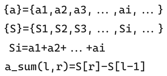 #include <iostream>using namespace std;const int N = 100010;int main() { ios::sync_with_stdio(false); int n, m; cin >> n >> m; int arr[N] = {0}; int sum[N] = {0}; for (int i = 1; i <= n; i++) { cin >> arr[i]; sum[i] = sum[i - 1] + arr[i]; } int l, r; for (int i = 1; i <= m; i++) { cin >> l >> r; cout << sum[r] - sum[l - 1] << endl; } return 0;}